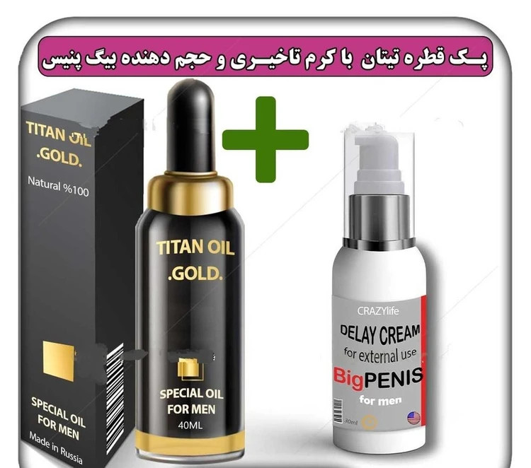 پک جنسی 2 عددی شامل قطره تیتان طلایی بزرگ کننده اندام خصوصی آقایان و کرم 3 کاره تاخیری ، افزایش سایز و نعوظ بیگ پنیس امریکایی وزن 40 گرم